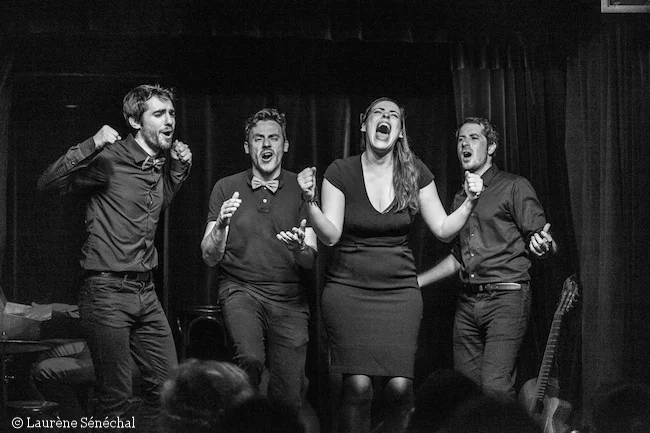 C'est dans la très branchée rue Frochot du SoPi (South Pigalle pour les non-intimes) que la troupe d'improvisateurs zélés de La Grimass (Fondée en 2009, une quinzaine de membres) se produit tous les samedis soirs, dans ce petit Théâtre Le Bout aux banquettes rouges et à la bonne ambiance. Un piano et deux guitares attendaient sur la scène les impro-chanteurs du soir, Guillain, Élise, Simon et Christof, accompagnés par le pianiste Bernard et des percussionnistes. Le présentateur du soir, Stéphane, demande au public de choisir un thème musical et un mot. Guillain, premier « cobaye » s'avance pour enflammer la salle sur un thème disco avec pour mot : « guimauve ». Entre la mélodie improvisée sur le moment, le comédien, en pleine invention d'un refrain cool et l'équipe en fond et soutien musical, on se dit qu'il y a un sacré talent et un bien joli culot. Puis c'est Simon, le guitariste fiévreux - du métro ! - qui doit rapper, Élise, la diva d'opéra (sacrée présence et sacrée voix) qui mène l'opérette avec ses fistons qui veulent partir à la guerre et Christof, sourire immense et décontract', qui fait le lover sur une musique country. La suite ? Solos d'harmonica, chansons improvisées à maîtriser en duo, refrain Disney d'une princesse transsexuelle et final complètement dingo pour encourager les propriétaires d'animaux à vêtir leurs pauvres bêtes.